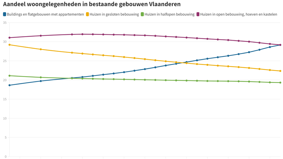 Le nombre d'appartements est en hausse en Flandre depuis un certain temps. Bien que l'augmentation se ralentisse actuellement, les appartements sont en passe de devenir la principale forme de logement des ménages. Cela s'explique par l'augmentation de l'efficacité spatiale de ...
